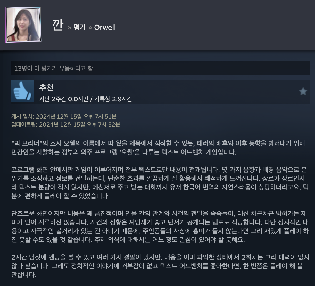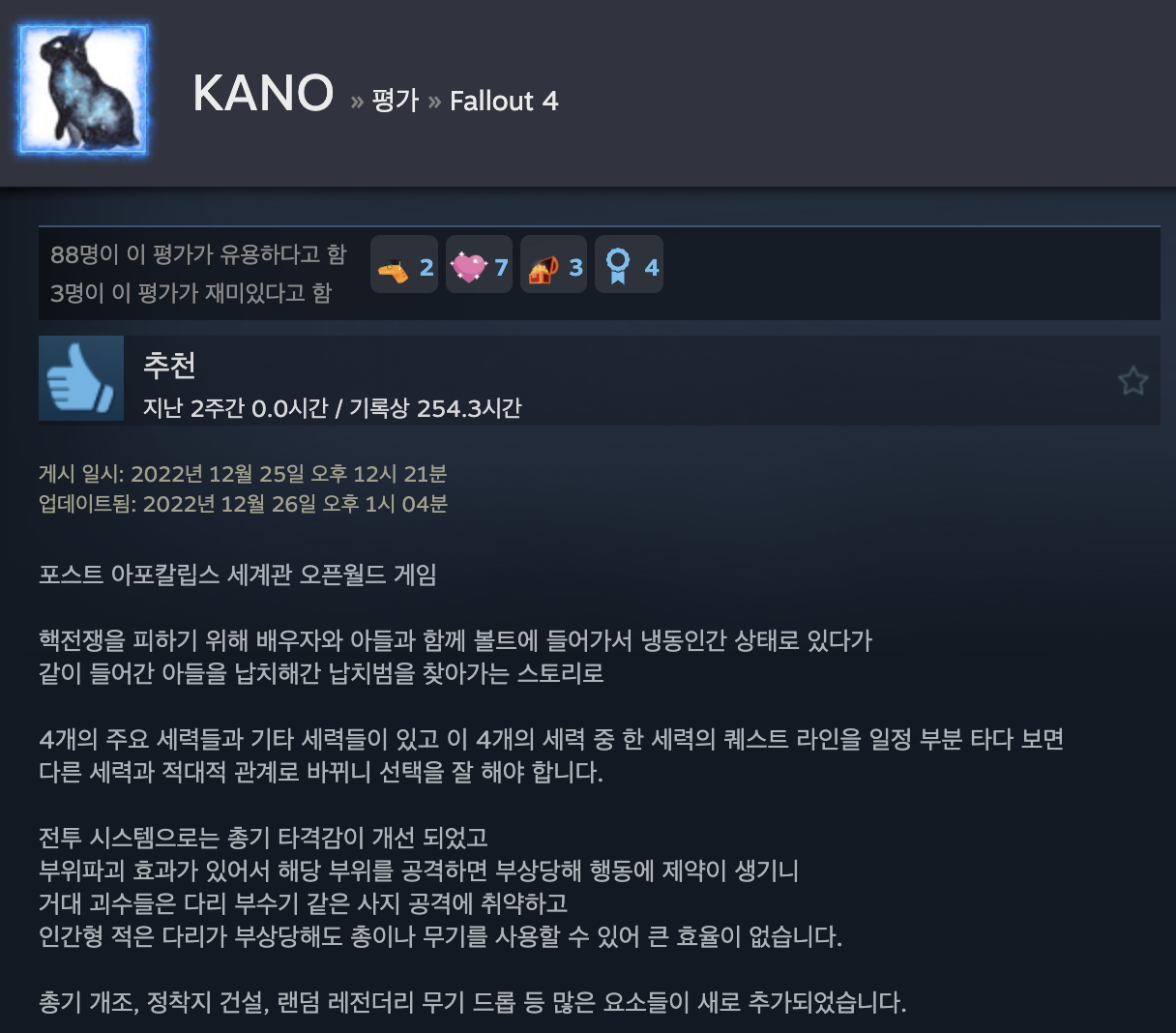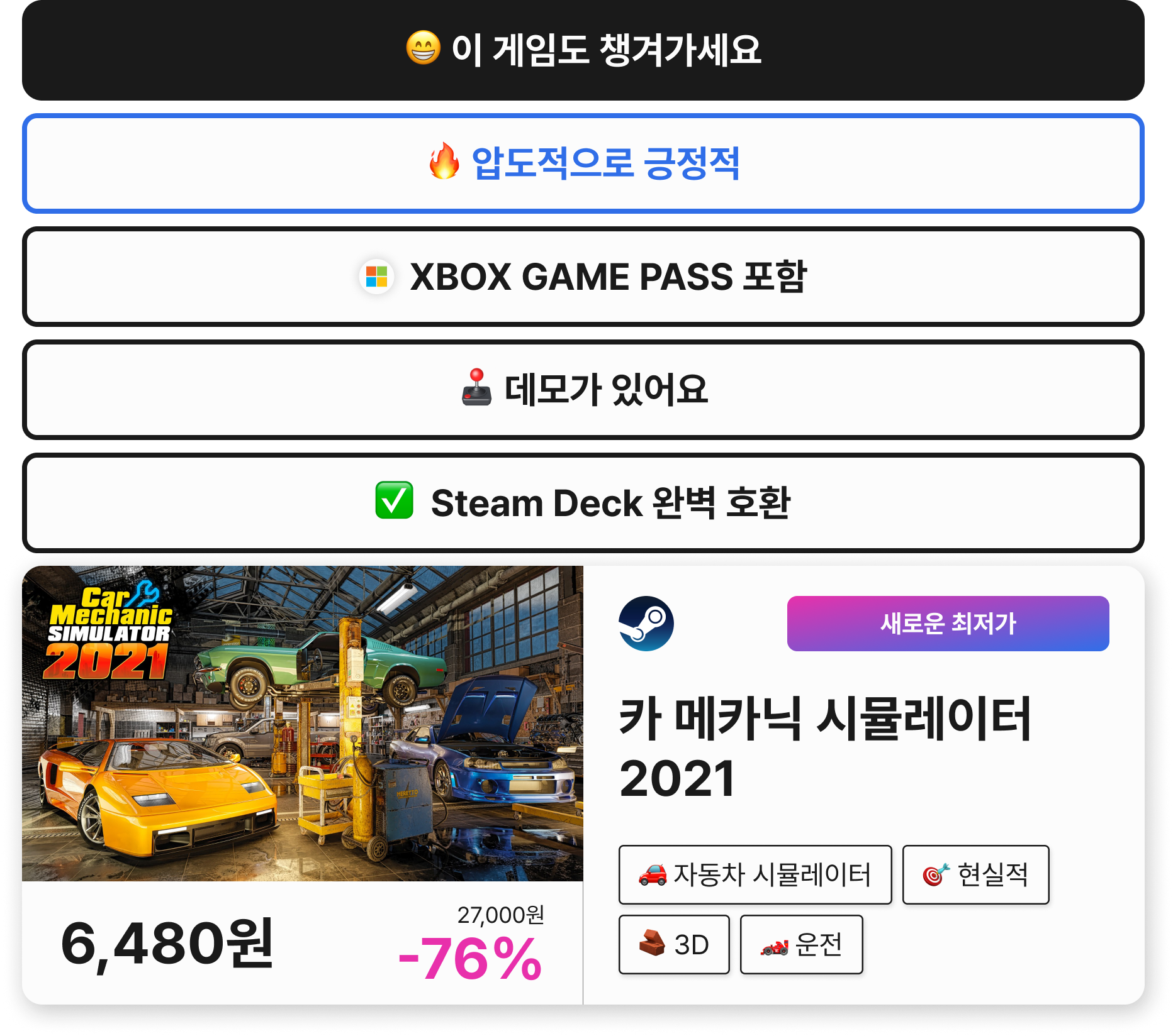 Steam ์ต๊ทผ ํ๊ฐ: ๋์ฒด๋ก ๊ธ์ ์ (74%)