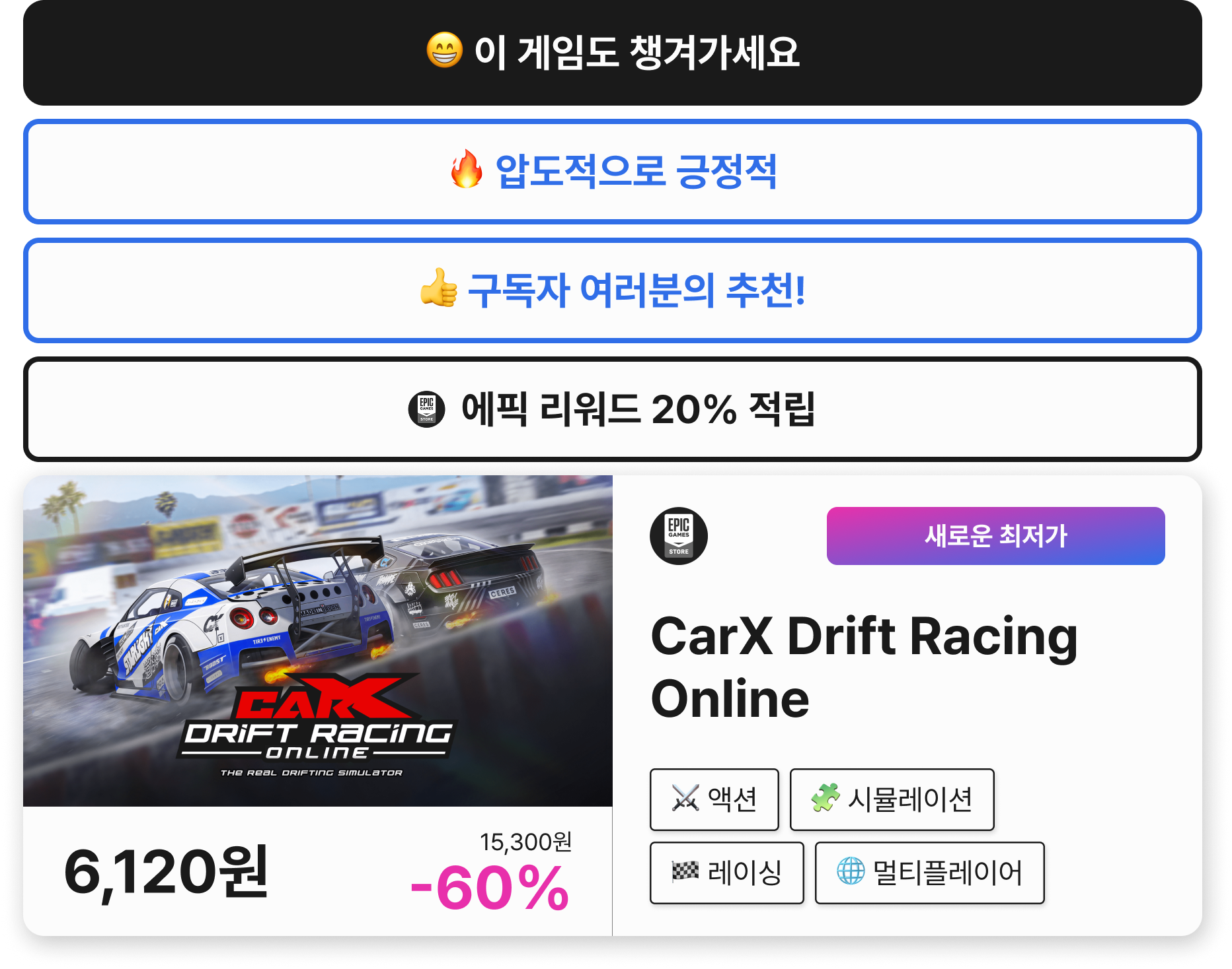 * ์ด ๊ฒ์์ "์นด๋ฆฌ๋๋ฉ3" ๋์ด ์ถ์ฒํด ์ฃผ์